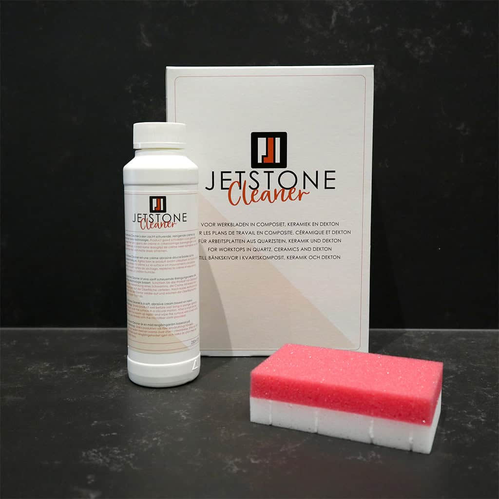 Jetstone-Reiniger (250ml) inklusive Schwamm und Pflegehinweise, sodass Ihre Küchenarbeitsplatte aus Mineralstein, Keramik oder Dekton in optimalem Zustand bleibt.